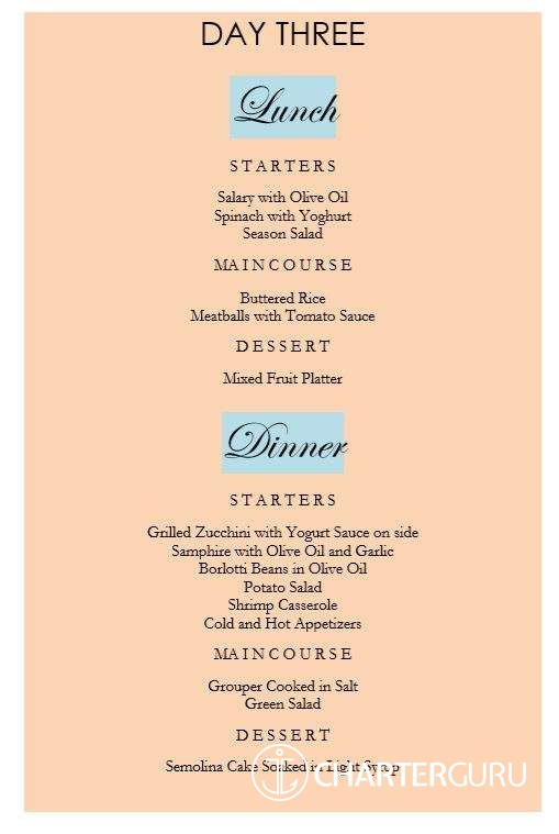 | 3 day charter | 11,000EUR to 13,250EUR | 2,200EUR to 3,975EUR | 2,200EUR to 2,650EUR | 15,400EUR to 19,875EUR | The usual formula is the 7 day charter rate divided by 6, times the number of days (3). Boat policy might differ. 22,000EUR / 6 * 3 days = 11,000EUR |