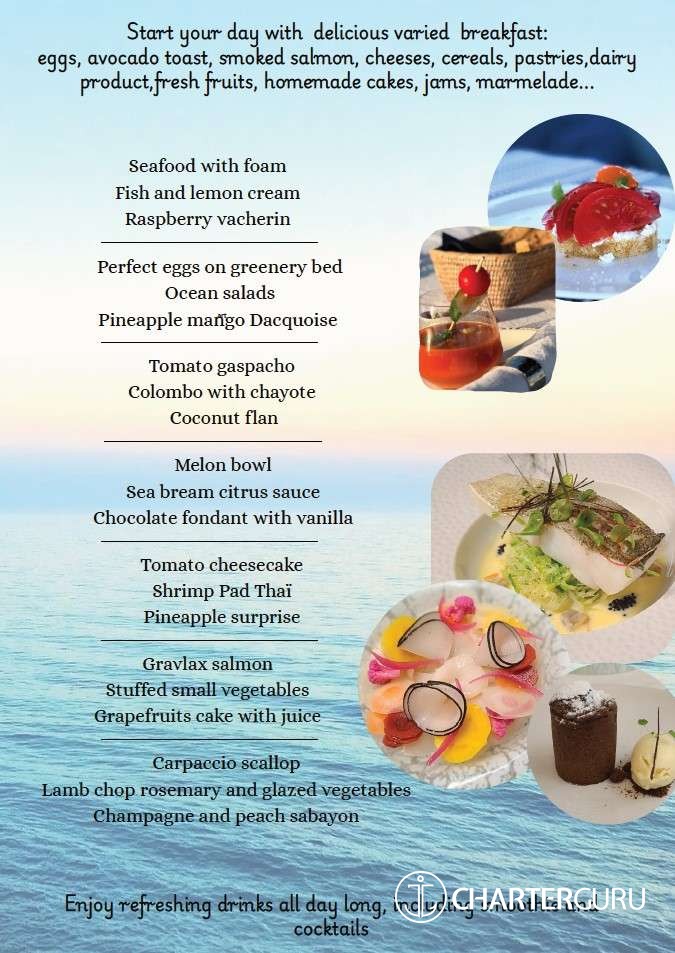 Thanks to my various experiences on monohulls and catamarans in the Caribbean sea and the Mediterranean sea, I am versatile. I like to please my guests, prepare healthy, fresh and regional meals.