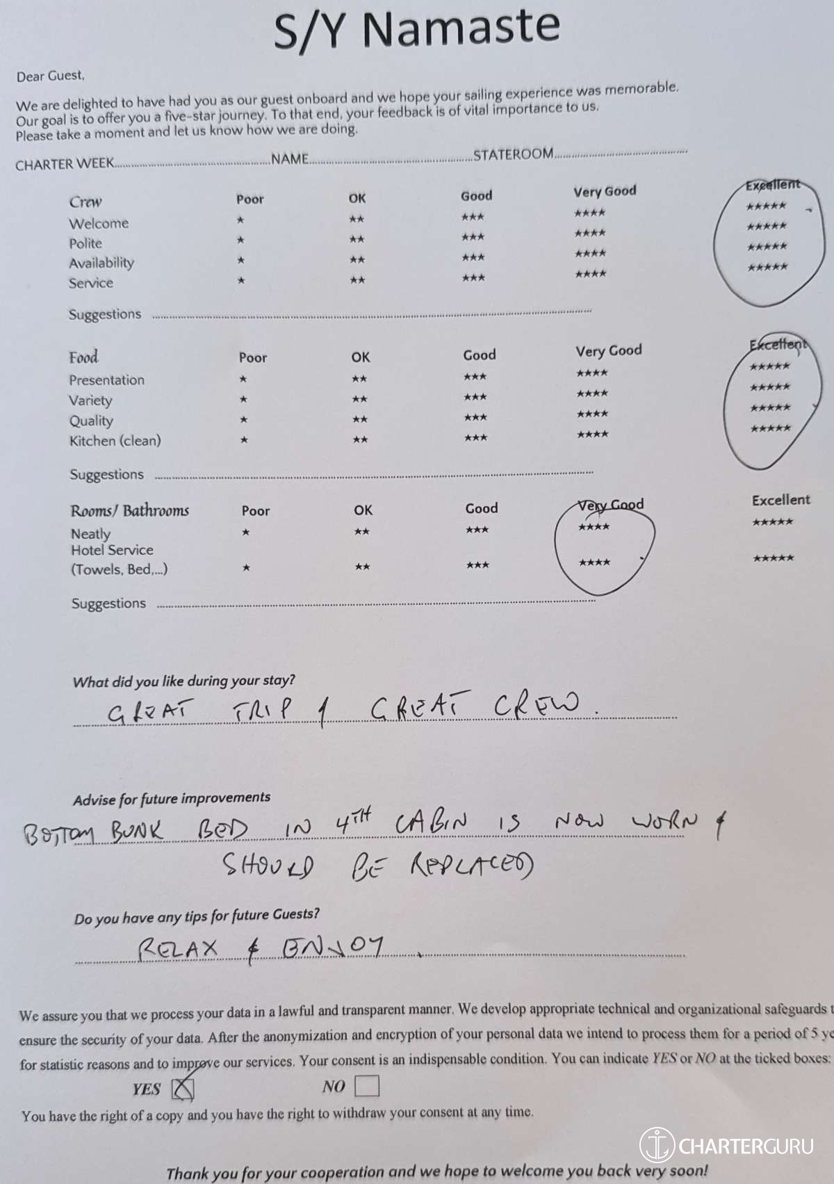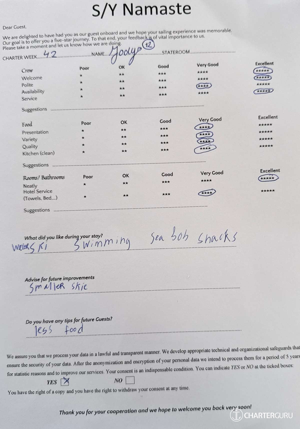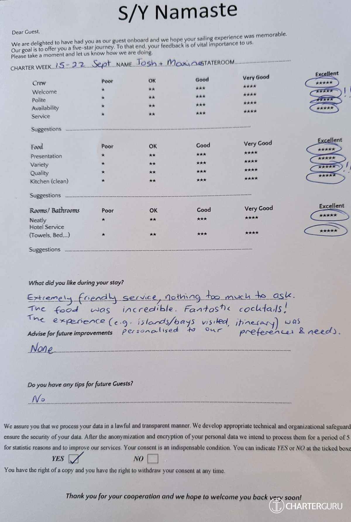 All additional/variable expenses such as Gas and Food are deducted from an Advance Provisioning Allowance (APA) - an additional deposit that is added on top of the charter price.