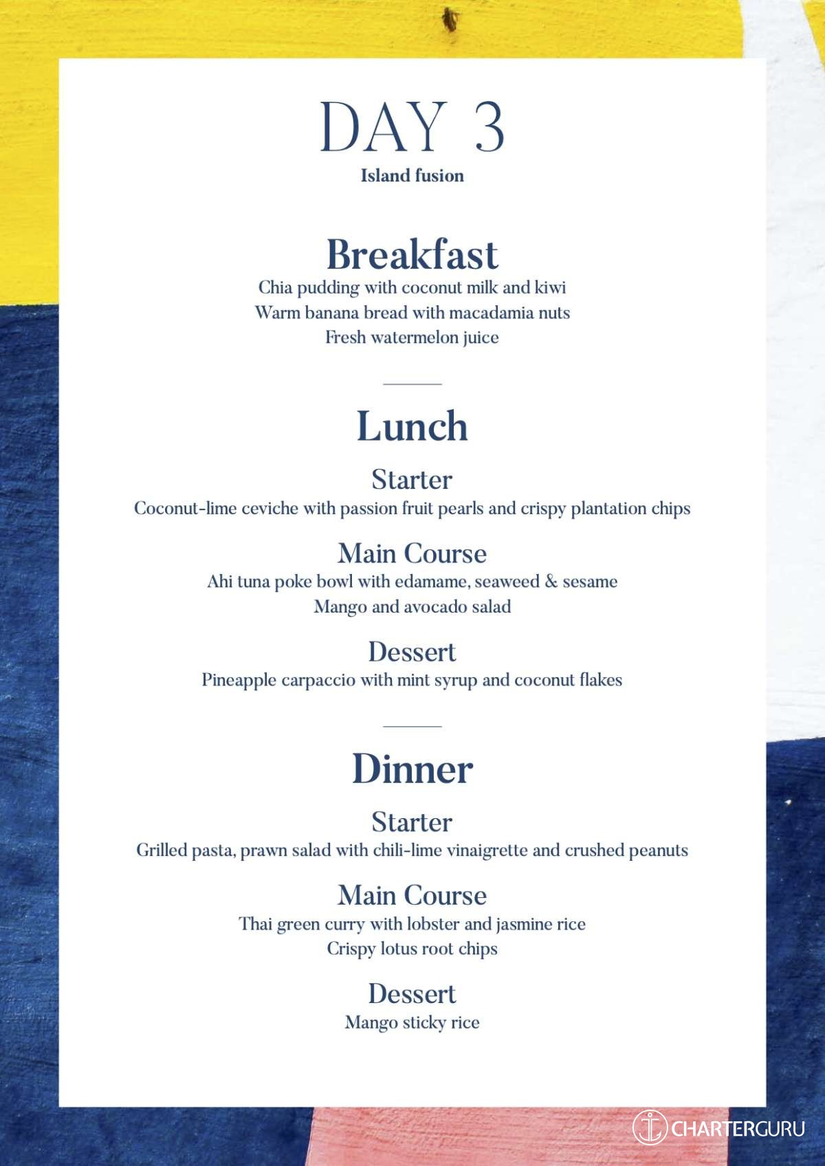| 3 day charter | 27,600EUR to 32,760EUR | 5,520EUR to 9,828EUR | 5,520EUR to 6,552EUR | 38,640EUR to 49,140EUR | The usual formula is the 7 day charter rate divided by 6, times the number of days (3). Boat policy might differ. 55,200EUR / 6 * 3 days = 27,600EUR |