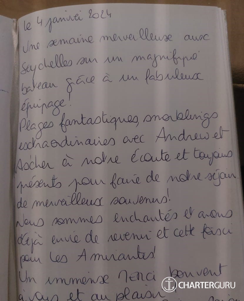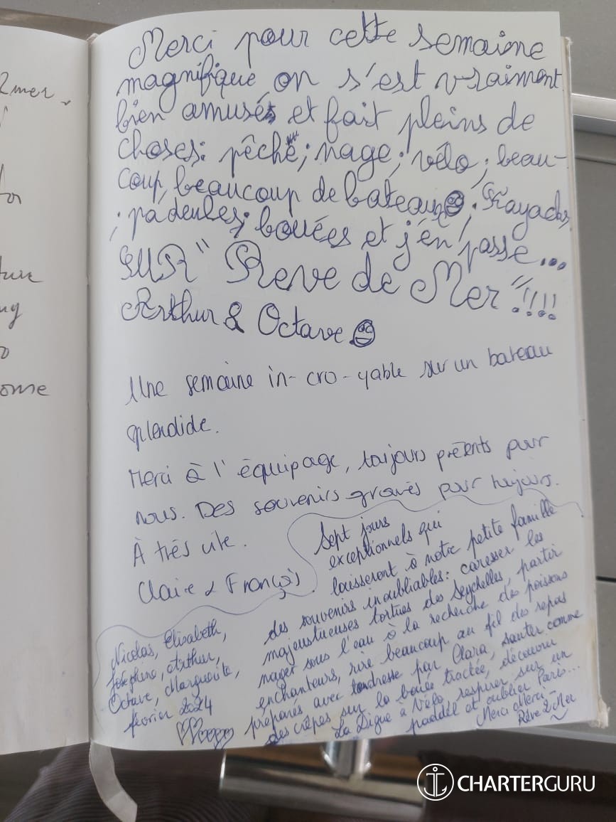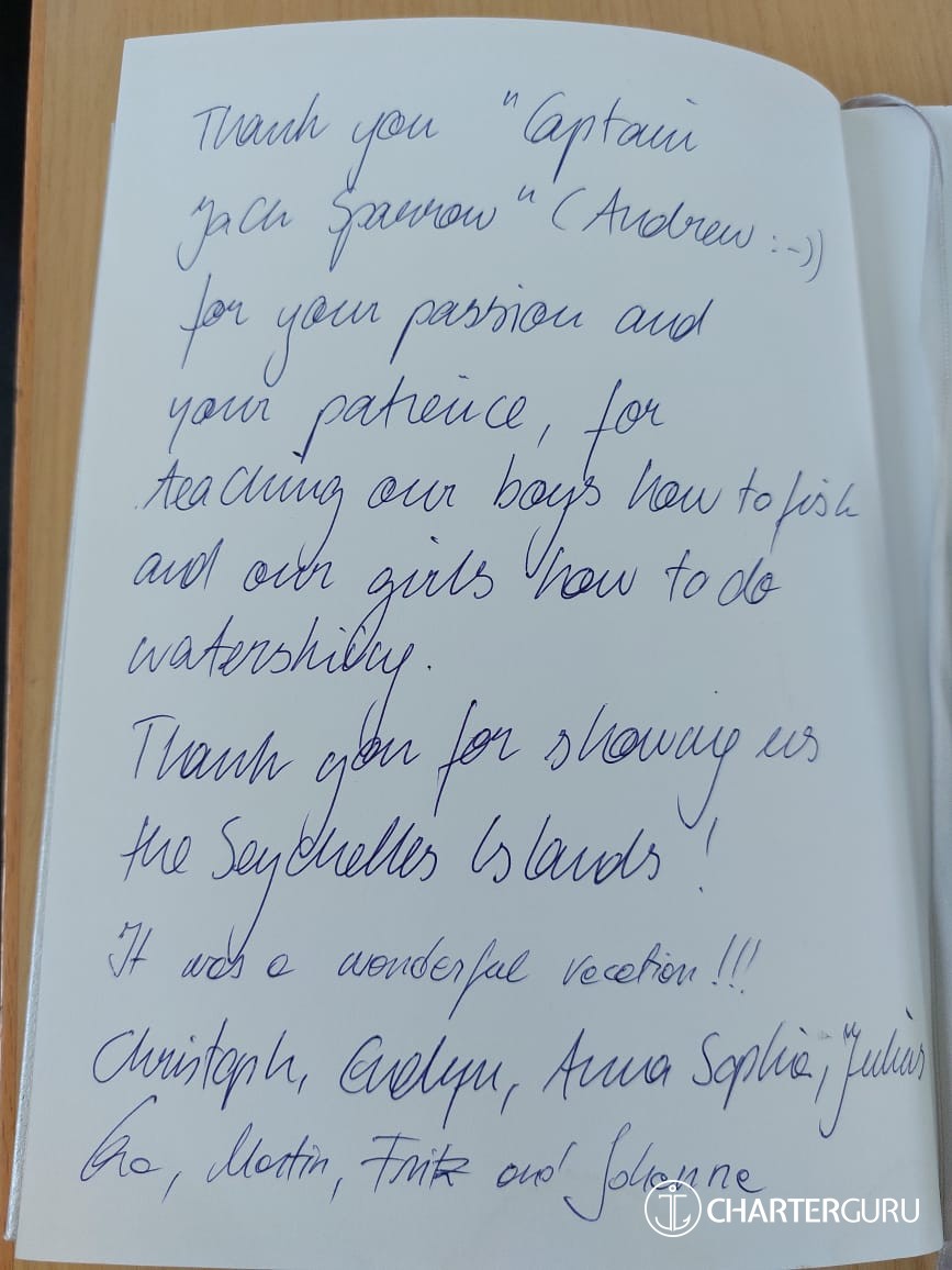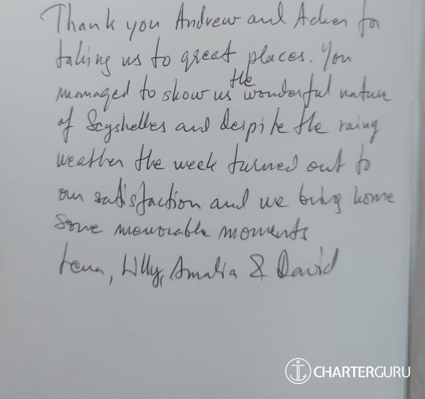 Thank you for the great adventure. Wonderful cook on board, better than the many restaurants of Seychelles.