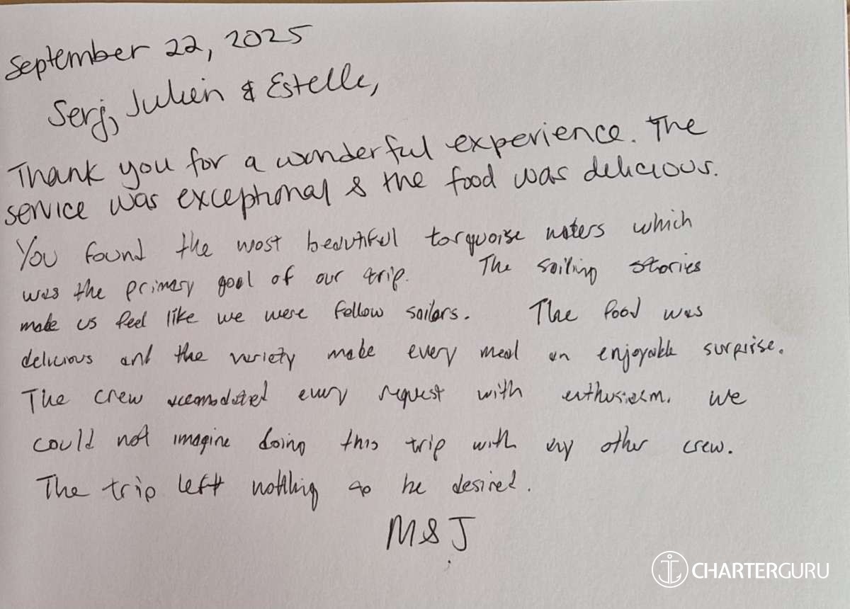 You'll be sailing on a brand new boat, equipped with several headsails to ensure that well-being and performance go hand in hand. Her night-blue hull, teak deck and Jacuzzi will convince you that you can really let go, the signature of an exceptional moment with 'The Blue Dream'.